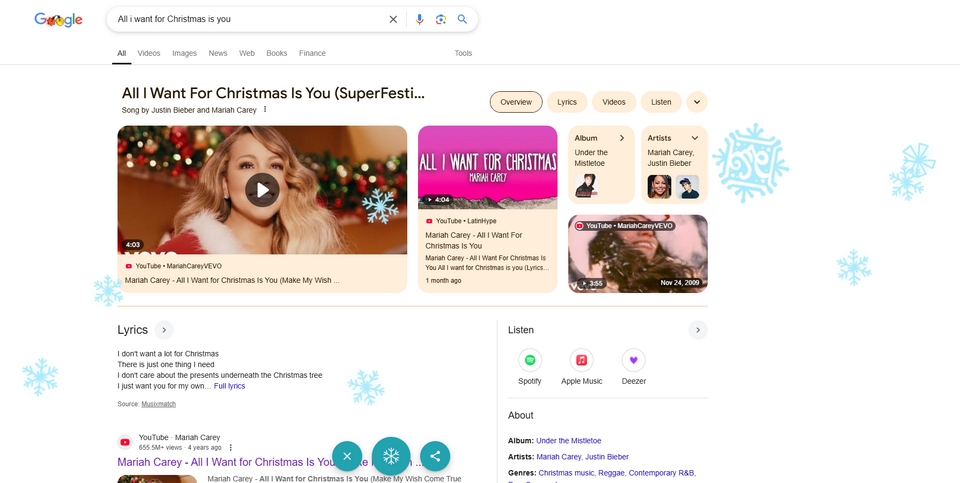 Ακόμη και η Google συμμετέχει σε αυτή τη γιορτή, προσθέτοντας μια festive πινελιά στην εμπειρία του χρήστη κάθε φορά που πληκτρολογεί τις λέξεις «All Ι want for Christmas is you» και «Mariah Carey» στη μηχανή αναζήτησης.