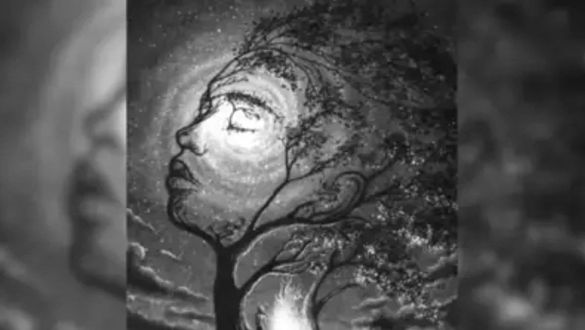 Στην ασπρόμαυρη εικόνα βλέπετε έναν έναστρο νυχτερινό ουρανό, ένα γυναικείο πρόσωπο και ένα δέντρο.