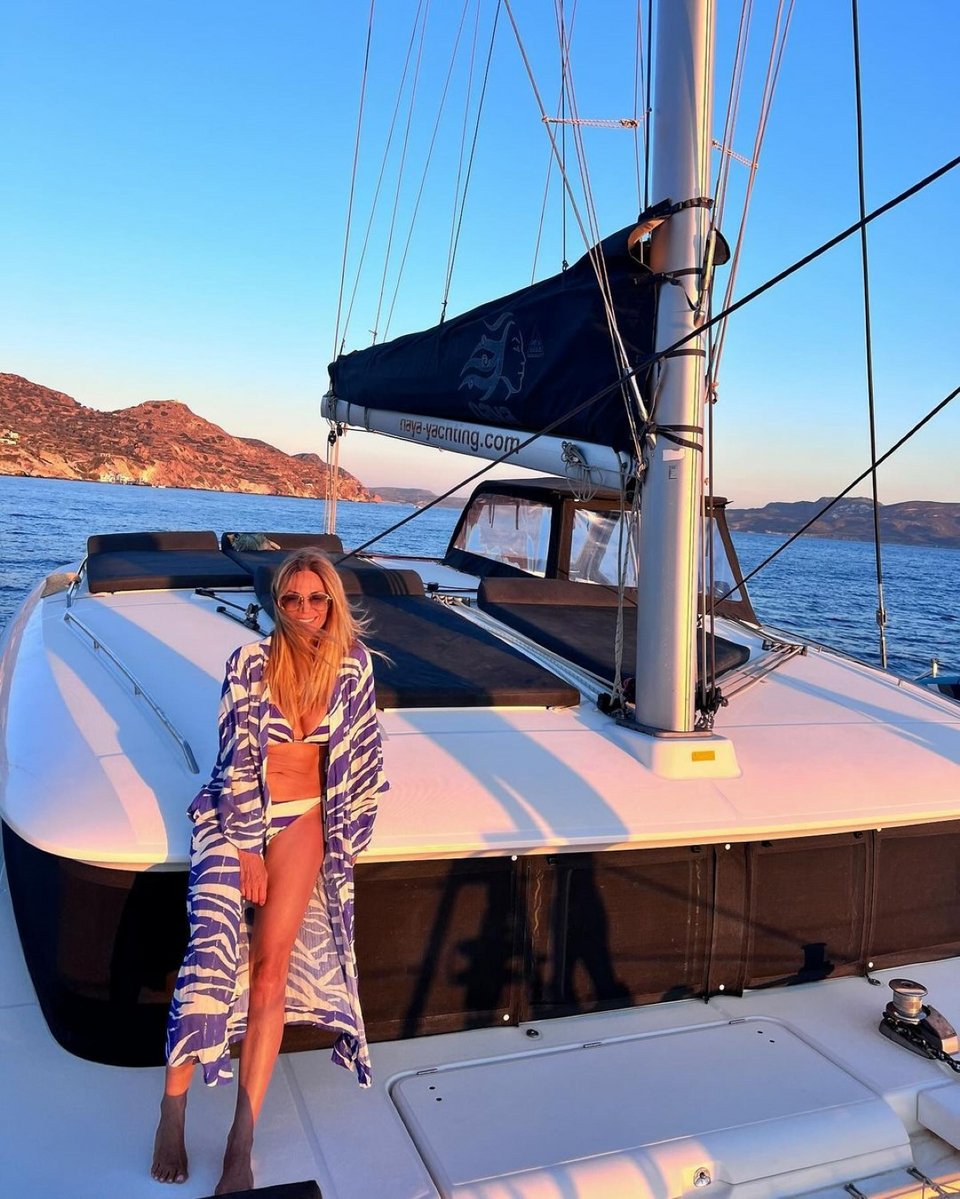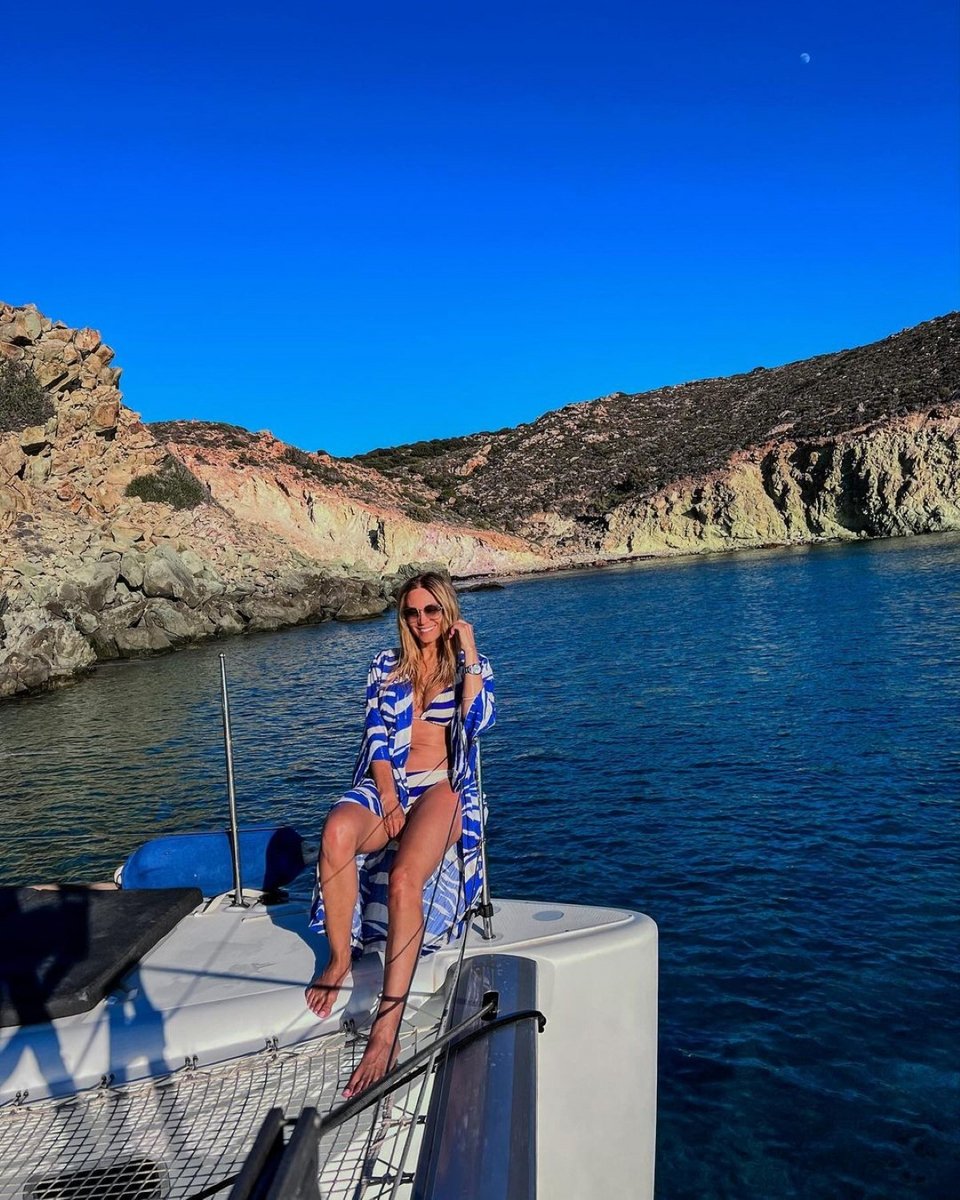 «Σαν το ηλιοβασίλεμα της Ελλάδας, πουθενά», σημείωσε η ίδια σε άλλη ανάρτησή της από τη Μήλο, όπου απολαμβάνει τη βόλτα της με σκάφος, με φόντο το ηλιοβασίλεμα.