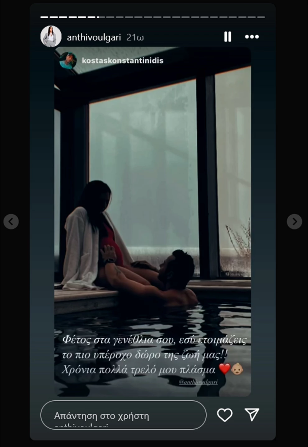 Ο Κώστας Κωνσταντινίδης ευχήθηκε χθες (13/02) στην Ανθή Βούλγαρη για τα γενέθλιά της, ανεβάζοντας μια ανάρτηση που «ξεχείλισε» έρωτα, αλλά και προσμονή για την άφιξη του παιδιού τους.