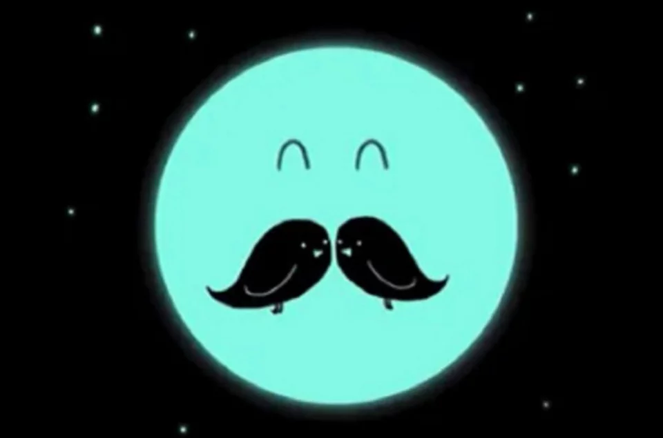 Η εικόνα δείχνει έναν τιρκουάζ κύκλο με ένα πρόσωπο και δύο πουλιά που σχηματίζουν ένα πλούσιο μουστάκι σε μαύρο φόντο.