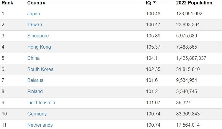 Εκεί βλέπουμε πως στην πρώτη θέση βρίσκεται η Ιαπωνία με το μέσο IQ του πληθυσμού της να φτάνει το 106.49, ενώ ακολουθούν η Ταϊβάν (106.57), η Σιγκαπούρη (105.89), το Χονγκ Κονγκ (105.37) και η Κίνα (104.10).