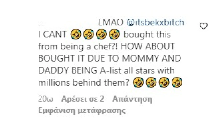 «Τι δουλειά κάνεις; Οι γονείς μου είναι πλούσιοι και αυτό είναι το vibe», «Τι δουλειά κάνεις; Γεννήθηκα. Γεννήθηκα σε μία οικογένεια εκατομμυρίων και τώρα παντρεύτηκα την κόρη ενός δισεκατομμυριούχου. Όμως είμαι σεφ» ήταν μόνο μερικά από τα ειρωνικά σχόλια που δέχτηκε ο Μπέκαμ.