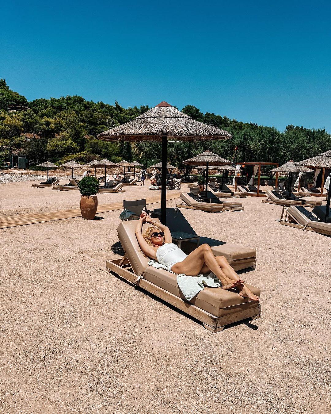 Συγκεκριμένα στη φωτογραφία που φορά το λευκό ολόσωμο μαγιό της κάθεται στην ξαπλώστρα φορώντας τα μαύρα γυαλιά ηλίου της και αμέριμνη ατενίζει ενώ σε επόμενες φωτογραφίες ποζάρει με μια λευκή ρόμπα, και με ένα λευκό φόρεμα με ένα μεγάλο ψάθινο καπέλο.