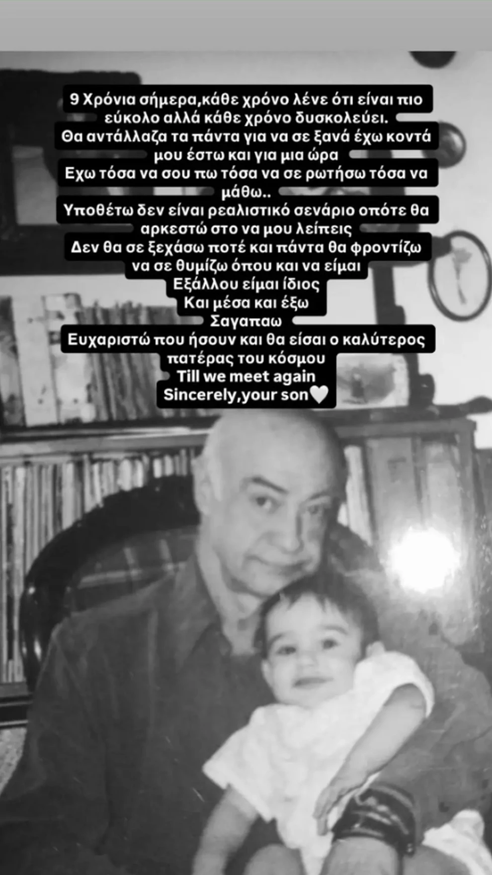 «9 χρόνια σήμερα, κάθε χρόνο λένε ότι είναι πιο εύκολο, αλλά κάθε χρόνο δυσκολεύει. Θα αντάλλαζα τα πάντα για να σε ξανά έχω κοντά μου έστω και για μία ώρα. Έχω τόσα να σου πω, τόσα να σε ρωτήσω, τόσα να μάθω. Υποθέτω δεν είναι ρεαλιστικό σενάριο, οπότε θα αρκεστώ στο να μου λείπεις» γράφει ο Νίκος Μπάρκουλης.