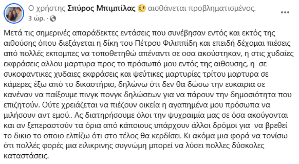 Όπως έγραψε ο Σπύρος Μπιμπίλας στο Facebook: «Μετά τις σημερινές απαράδεκτες εντάσεις που συνέβησαν εντός και εκτός της αιθούσης, όπου διεξάγεται η δίκη του Πέτρου Φιλιππίδη και επειδή δέχομαι πιέσεις από πολλές εκπομπές να τοποθετηθώ απέναντι σε όσα ακούστηκαν, η στις χυδαίες εκφράσεις άλλου μάρτυρα προς το πρόσωπό μου εντός της αιθούσης, η σε συκοφαντικές χυδαίες εκφράσεις και ψεύτικες μαρτυρίες τρίτου μάρτυρα σε κάμερες έξω από το δικαστήριο, δηλώνω ότι δεν θα δώσω την ευκαιρία σε κανέναν να παίξουμε πινγκ πονγκ δηλώσεων για να πάρουν τη δημοσιότητα που επιζητούν».