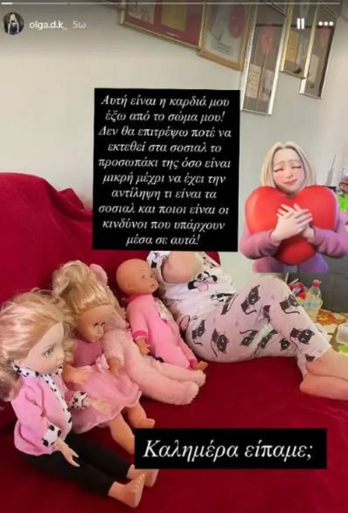 Με ένα στιγμιότυπο στον λογαριασμό της στο instagram, η κόρη της Άντζελας Δημητρίου, Όλγα Κιουρτσάκη, τόνισε πως δεν θα επιτρέψει να εκτεθεί το πρόσωπο της κόρης της στα social media, όσο είναι ακόμη μικρή.
