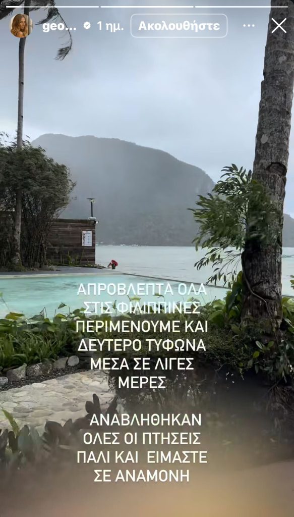 Στις Φιλιππίνες βρίσκεται η Στέλλα Γεωργιάδου, η οποία ενημέρωσε πως στην ασιατική χώρα, περιμένουν δεύτερο «κύμα» τυφώνα, σημειώνοντας παράλληλα πως «αναβλήθηκαν όλες οι πτήσεις και είμαστε σε αναμονή».