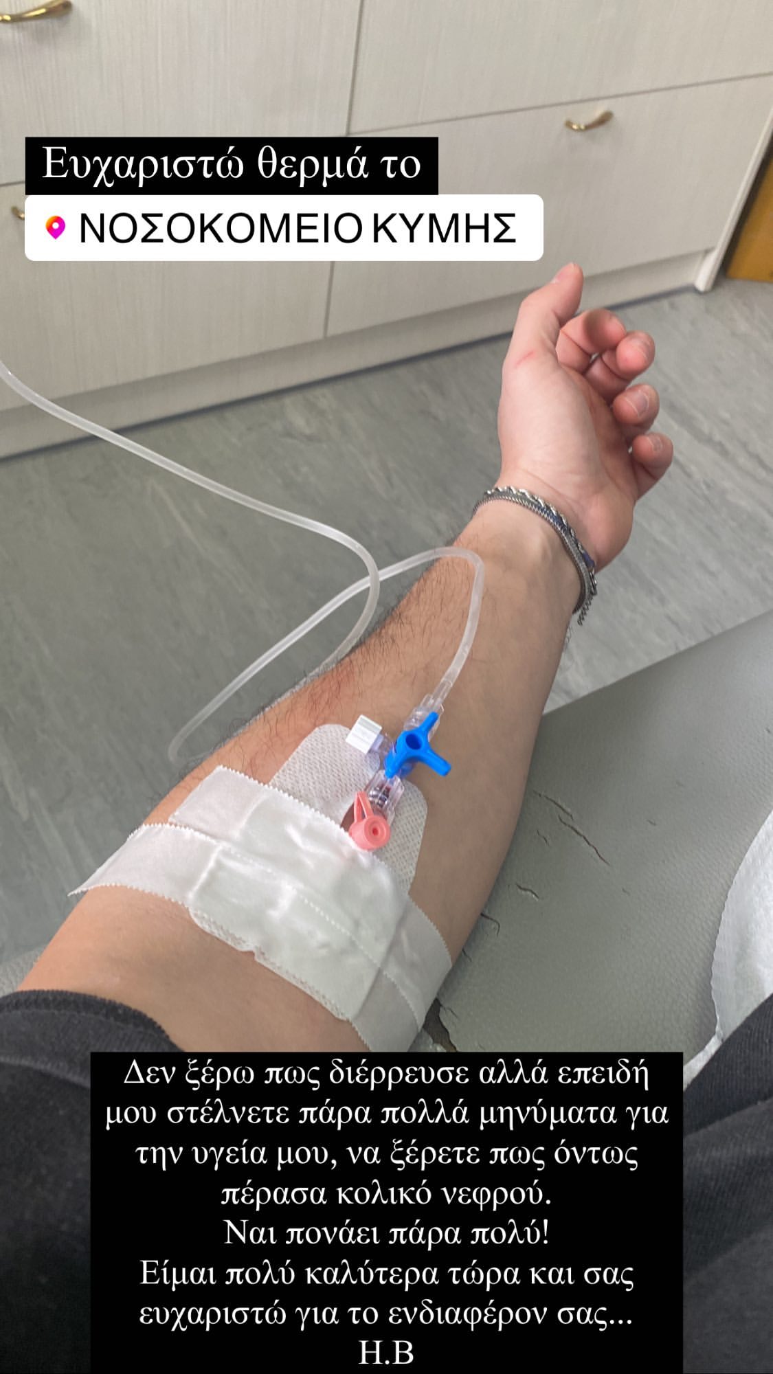 «Ευχαριστώ θερμά το νοσοκομείο Κύμης! Δεν ξέρω πως διέρρευσε αλλά επειδή μου στέλνετε πάρα πολλά μηνύματα για την υγεία μου, να ξέρετε πως όντως πέρασα κολικό νεφρού. Ναι πονάει πάρα πολύ! Είμαι πολύ καλύτερα τώρα και σας ευχαριστώ για το ενδιαφέρον σας», έγραψε ο Ηλίας Βρεττός.