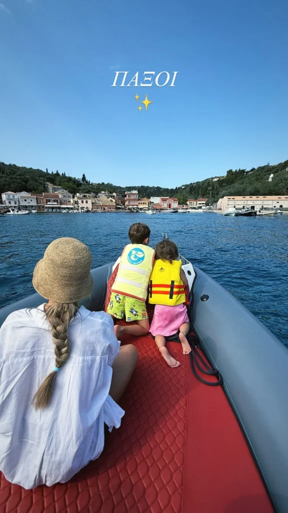 Όπως μπορούμε να δούμε, το ζευγάρι μαζί με τα παιδιά της ηθοποιού πήραν φουσκωτό στις παραλίες του νησιού, σε πανέμορφα νερά, και επισκέφτηκαν το λιμάνι του Γάιου και τις Γαλάζιες Σπηλιές αλλά και τους Αντίπαξους.