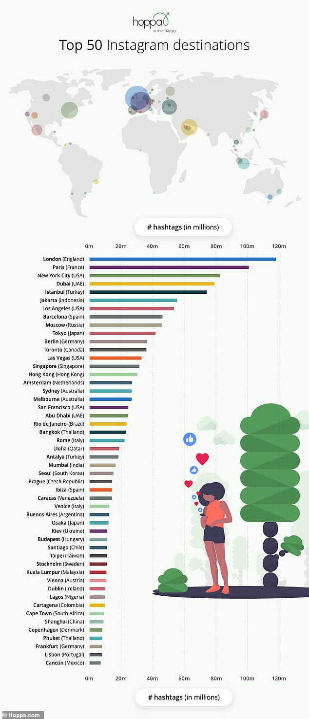 Τα αποτελέσματα έχουν προκύψει από την Hoppa, μια ιστοσελίδα που σε βοηθά να κλείσεις το ταξίδι σου. Μιλώντας με νούμερα, πάνω από 120 εκατ. hashtags αφορούσαν το Λονδίνο, λίγο παραπάνω από 100 εκατ. αφορούσαν το Παρίσι και περίπου 80 εκατ. hashtags τη Νέα Υόρκη.