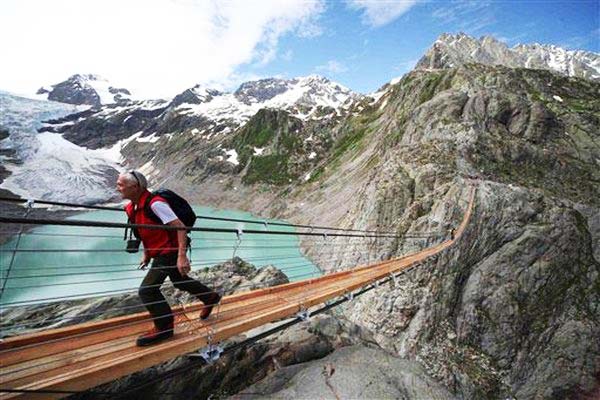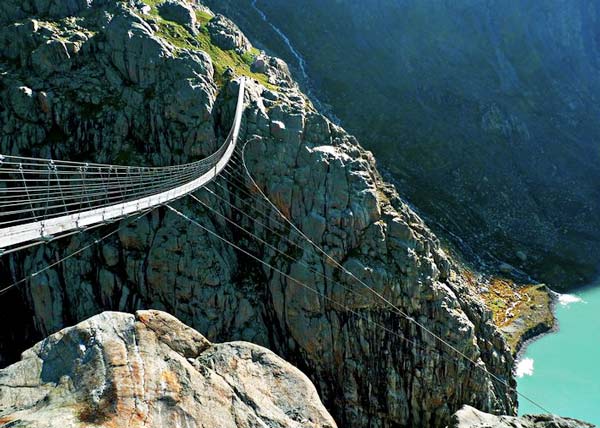 Η Trift Bridge, όπως ονομάζεται, είναι μία από τις πιο θεαματικές πεζογέφυρες των Άλπεων, μήκους 170 μέτρων, η οποία διασχίζει το φαράγγι πάνω από τη λίμνη Triftsee, στην περιοχή Gadmen της Ελβετίας, προσφέροντας μοναδικές εικόνες στους τολμηρούς πεζοπόρους.