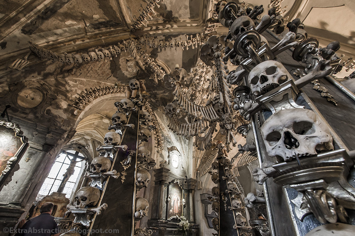 Από το κέντρο του ναού κρέμεται ένας τεράστιος πολυέλαιος οστών με γιρλάντες κρανίων ενώ ακόμα και τα προστατευτικά που πλαισιώνουν το βωμό είναι φτιαγμένα από ανθρώπινα κόκαλα.
