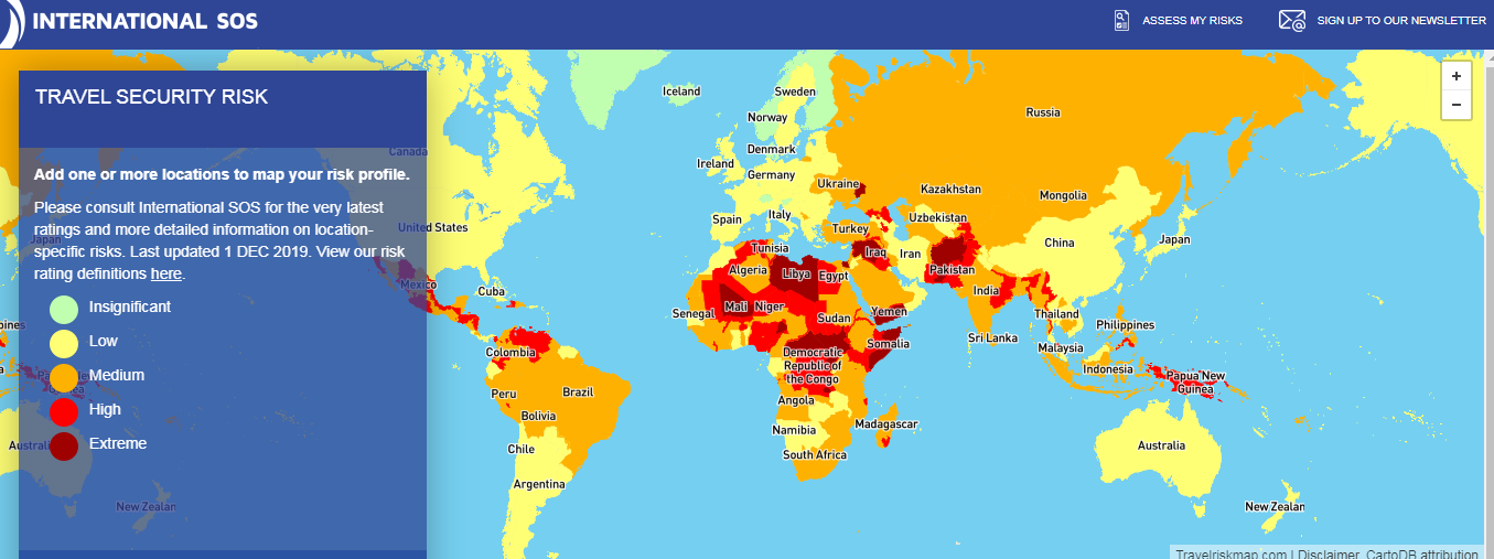 Η International SOS, μια εταιρεία παροχής υπηρεσιών ταξιδιωτικής ασφάλειας, έχει αποκαλύψει τον ετήσιο ταξιδιωτικό χάρτη κινδύνου για το προσεχές έτος, θέλοντας να βοηθήσει όσους σχεδιάζουν ταξίδια για το 2020.