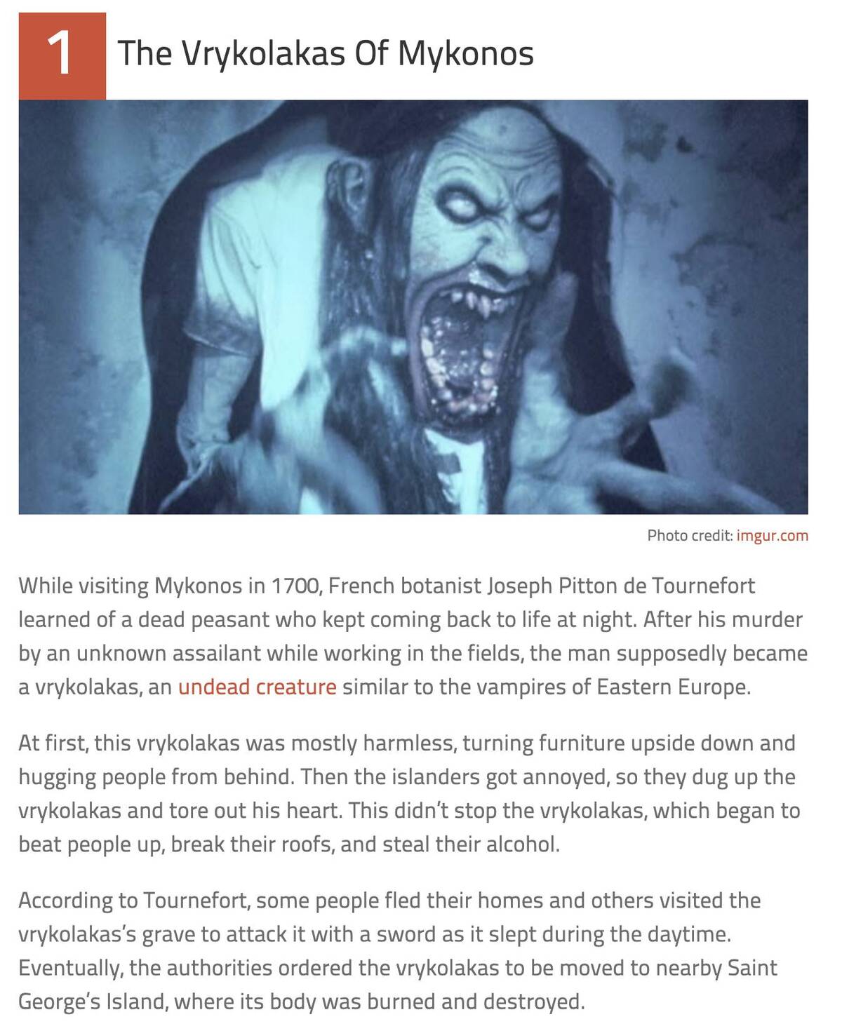 «Κατά την διάρκεια της επίσκεψής του στη Μύκονο, το 1.700, ο Γάλλος βοτανολόγος, Joseph Pitton de Tournefort, έμαθε για έναν νεκρό χωρικό ο οποίος επέστρεφε τα βράδια στη ζωή.