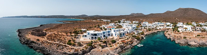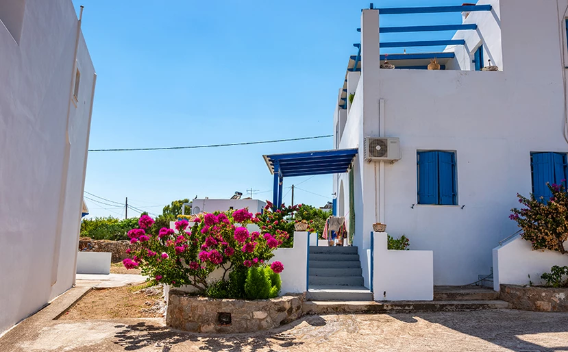 Τα λιγοστά σπίτια του χωριού είναι πάλλευκα και με χρωματιστές λεπτομέρειες από τις φούξια βουκαμβίλιες και τα μπλε πορτοπαράθυρα, με έντονες αιγιοπελαγίτικες επιρροές, ενώ ο οικισμός φημίζεται για τις ψαροταβέρνες με θέα στο μικρό και γραφικό κόλπο.