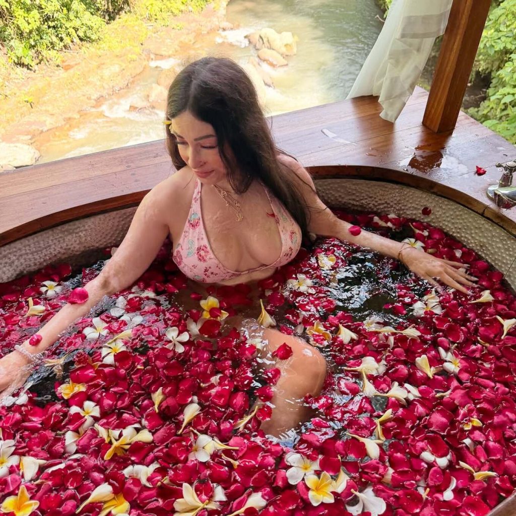 Στις εικόνες που μοιράστηκε με τους διαδικτυακούς της φίλους, φαίνεται να απολαμβάνει το μπάνιο της, μέσα σε ξύλινη μπανιέρα γεμάτη ροδοπέταλα και άνθη.