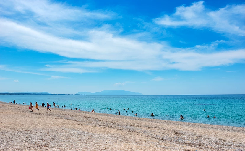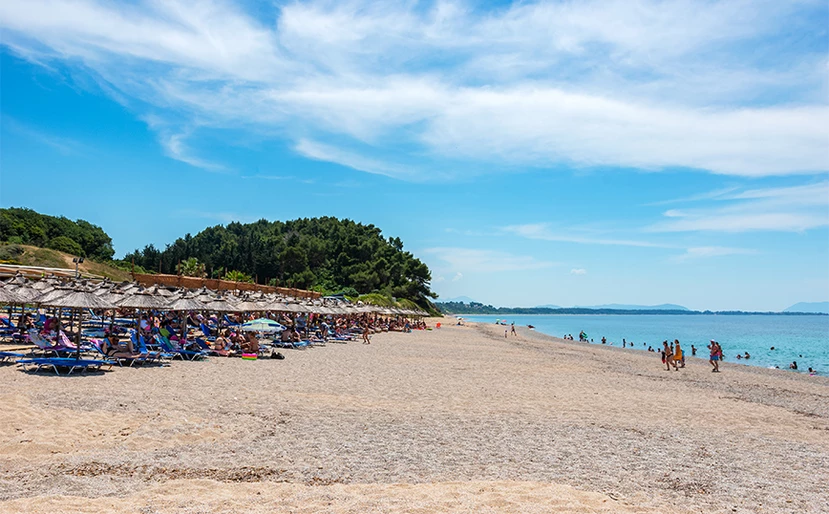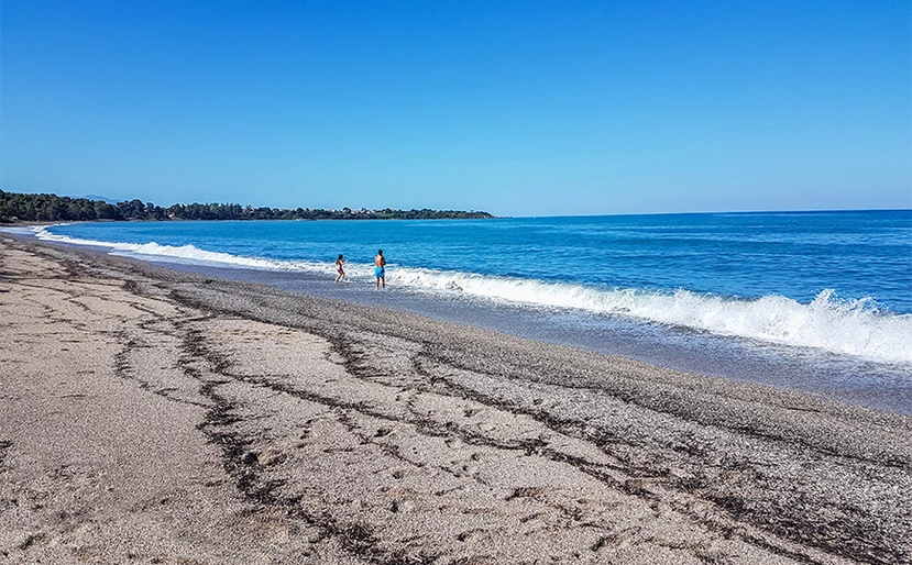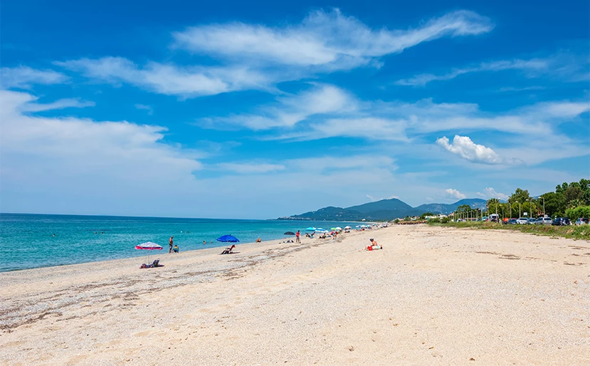 Οργανωμένη σε σημεία, αλλά και με μεγάλα μέρη της εντελώς ανέγγιχτα για εκείνους που θέλουν να απολαύσουν την παραλία στο μεγαλείο της μακριά από τη βουή του κόσμου -ευκάλυπτοι χαρίζουν την ανακουφιστική σκιά τους-, η ακτή διαθέτει μια χρυσαφένια απέραντη αμμουδιά, ενώ τα χαρακτηριστικά διαυγή νερά του Ιονίου δεν αφήνουν κανέναν ασυγκίνητο.