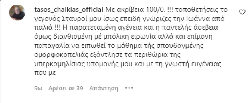 Με τη σειρά του λοιπόν, ο Τάσος Χαλκιάς σχολίασε κάτω από τη δημοσίευση του συναδέλφου του: «Με ακρίβεια 100/0!!! τοποθετήσεις το γεγονός Σταύρο μου ίσως επειδή γνώριζες την Ιωάννα από παλιά!!! Η παρατεταμένη αγένεια και η παντελής ασέβεια όμως διανθισμένη με μπόλικη ειρωνεία αλλά και επίμονη παπαγαλία να ειπωθεί το μάθημα τής σπουδαγμένης ομορφοκοπελιάς εξάντλησε τα περιθώρια της υπερκαμηλίσιας υπομονής μου και με τη γνωστή ευγένειας που με διακρίνει κράτησα τις ισορροπίες… Την αγάπη μου σε όλους τους ενδιαφερόμενους».