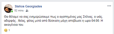 Η δυσάρεστη είδηση έγινε γνωστή μέσα από τον προσωπικό του λογαριασμό στο Facebook, που χειριζόταν τις τελευταίες ημέρες φιλικό του πρόσωπο.