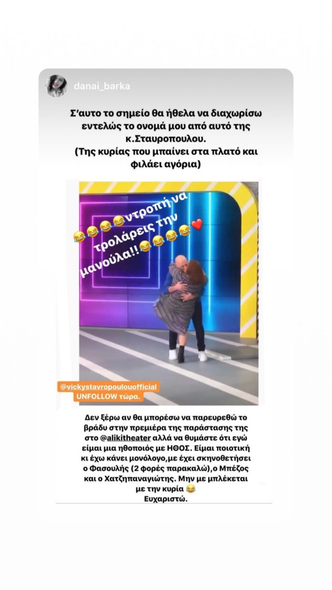 Άμεση ήταν η αντίδραση της κόρης της Βίκυς Σταυροπούλου, Δανάης Μπάρκα. «Σε αυτό το σημείο, θα ήθελα να διαχωρίσω εντελώς το όνομά μου από αυτό της κ. Σταυροπούλου. (Της κυρίας που μπαίνει στα πλατό και φιλάει αγόρια», έγραψε μεταξύ άλλων σε instastory η Δανάη.