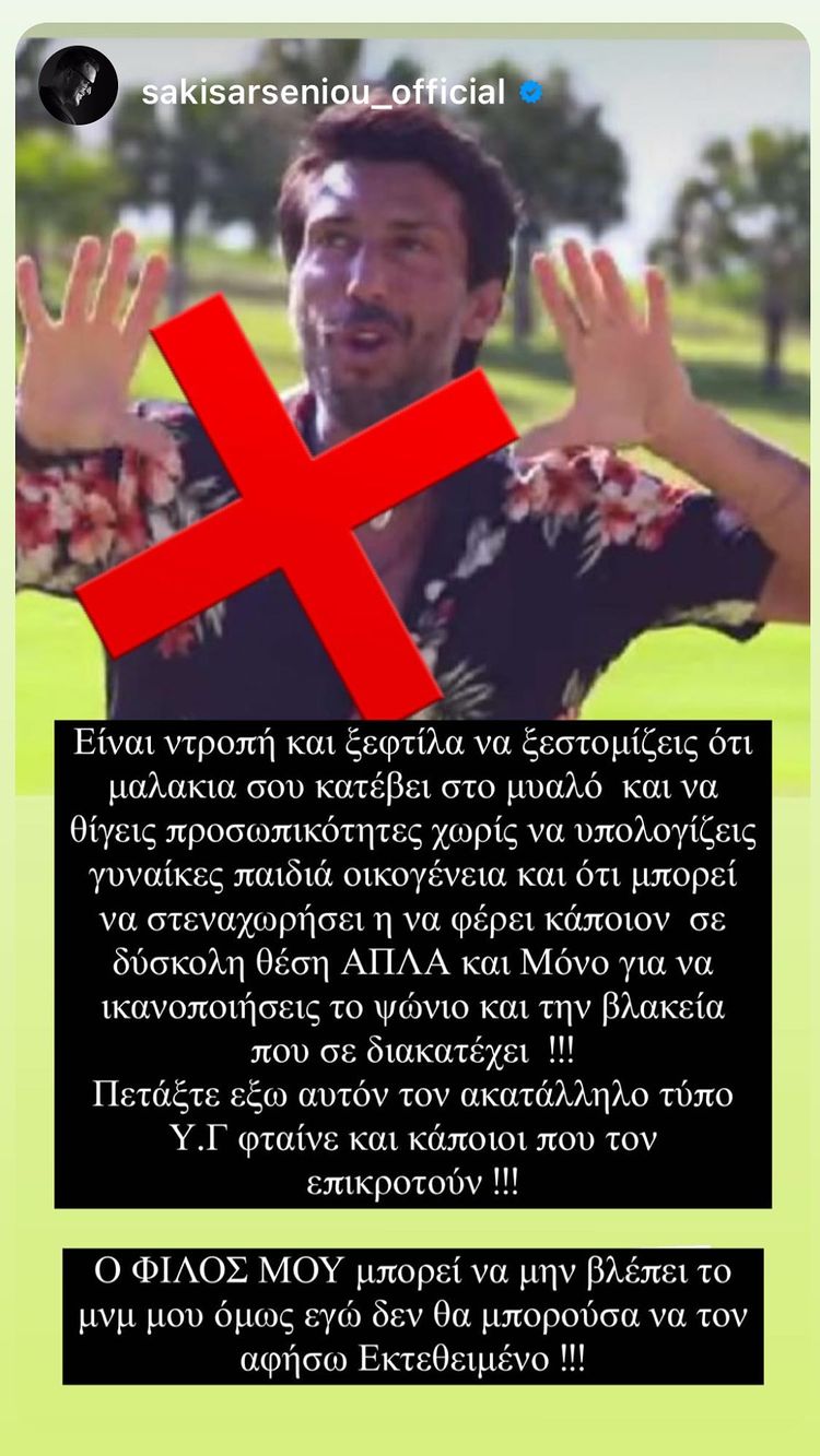 «Είναι ντροπή και ξεφτίλα να ξεστομίζεις ότι μ@@@@ σου κατέβει στο μυαλό και να θίγεις προσωπικότητες χωρίς να υπολογίσεις γυναίκες, παιδιά, οικογένεια και ό,τι μπορεί να στεναχωρήσει ή να φέρει κάποιον σε δύσκολη θέση απλά και μόνο για να ικανοποιήσεις το ψώνιο και τη βλακεία που σε διακατέχει. Πετάξτε έξω αυτό τον κατάλληλο τύπο» έγραψε χαρακτηριστικά ο Αρσενίου.