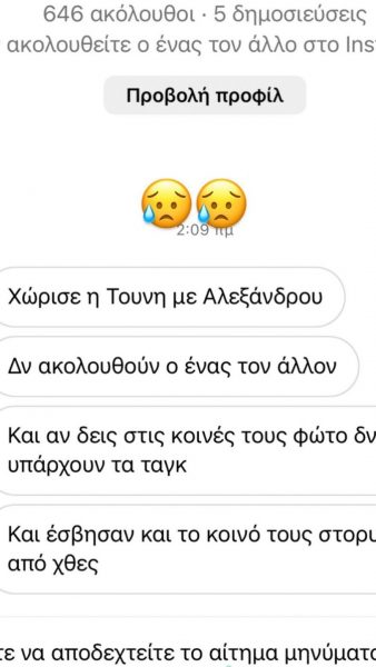 Όλα ξεκίνησαν από τον βομβαρδισμό μηνυμάτων που δέχτηκε το βράδυ της Δευτέρας στο προφίλ της Σούλας Γκλάμορους, αναφορικά με το ότι ο Δημήτρης έχει αφαιρέσει όλα τα tag με το όνομά του από τις κοινές φωτογραφίες που έχει με την Τούνη και το αντίστροφο!