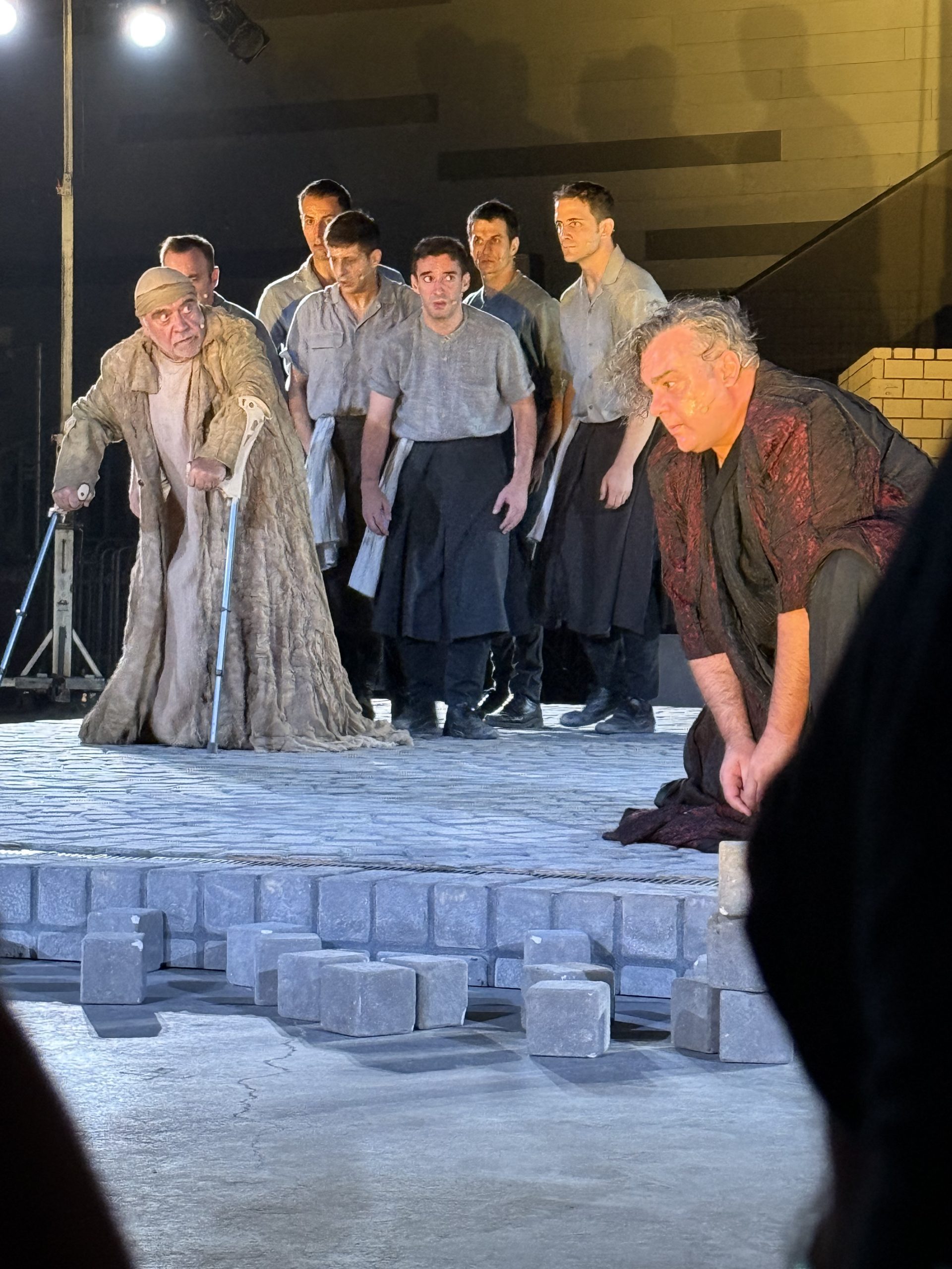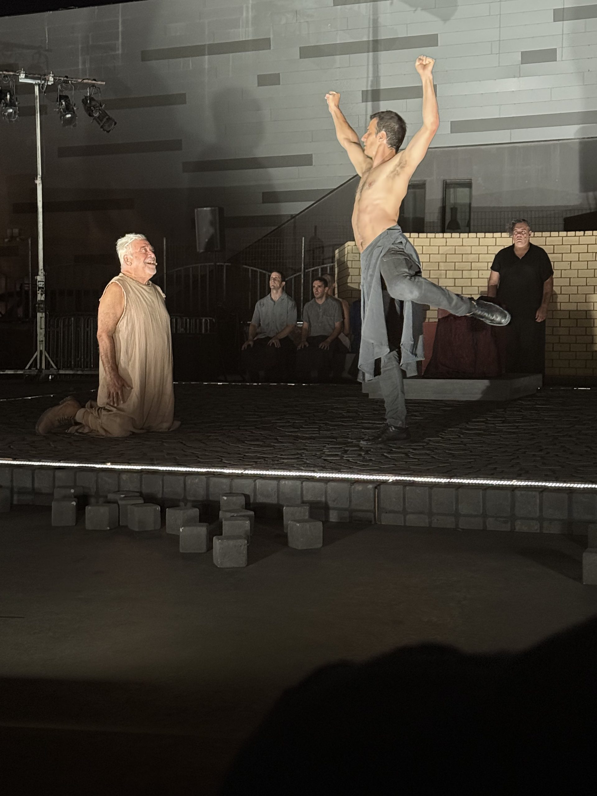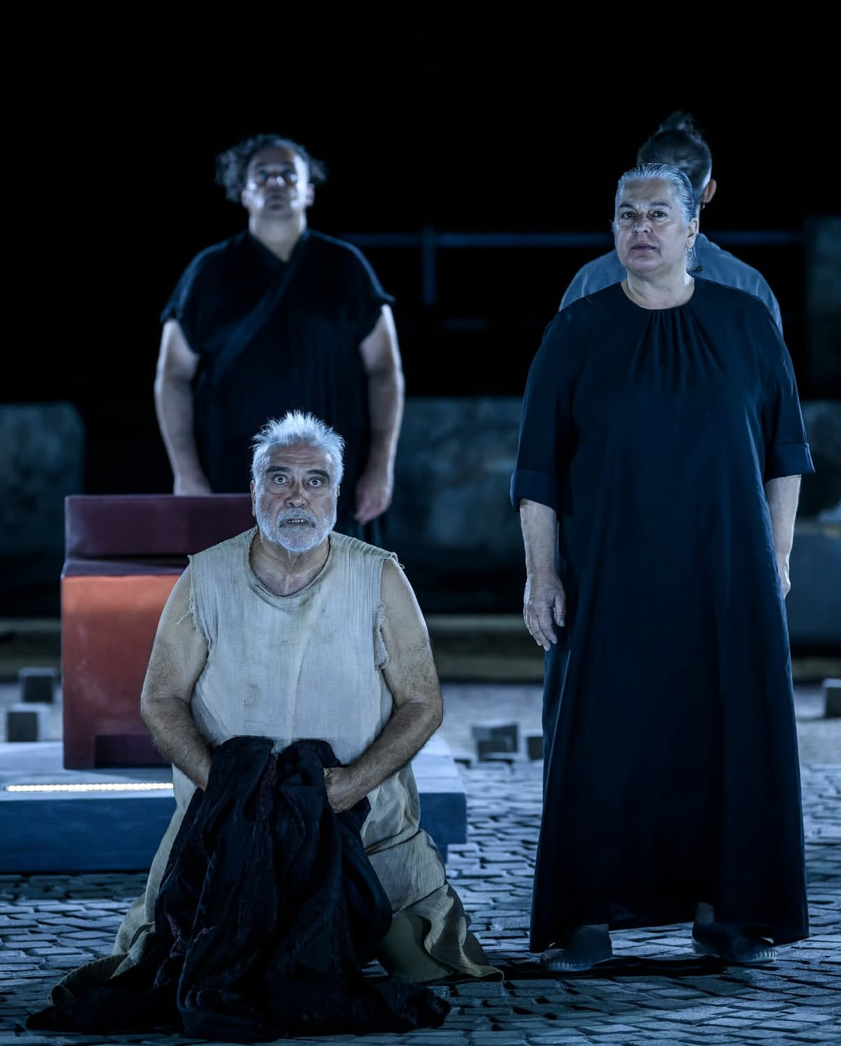Ο Γιάννης Νταλιάνης με στιβαρότητα και κύρος και αναμφισβήτητη εμπειρία υποδύεται ένα αλαζόνα και κυνικό Μενέλαο που θα τραπεί σε φυγή αδυνατώντας να σταθεί με παρρησία απέναντι στα αδιάσειστα επιχειρήματα του γέροντα Πηλέα που και το βασίλειο υπερασπίζεται και τον απόγονο του, καρπό ενός βιασμού που φέρνει στα σπλάχνα της η Ανδρομάχη.