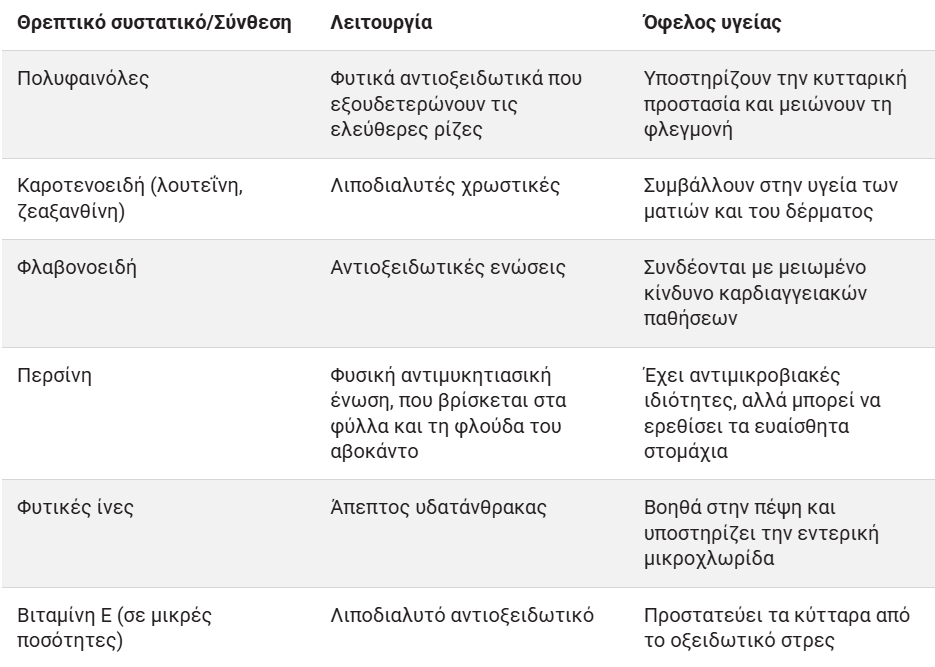 Ο παρακάτω πίνακας συνοψίζει τις κύριες ενώσεις που βρίσκονται στη φλούδα του αβοκάντο.