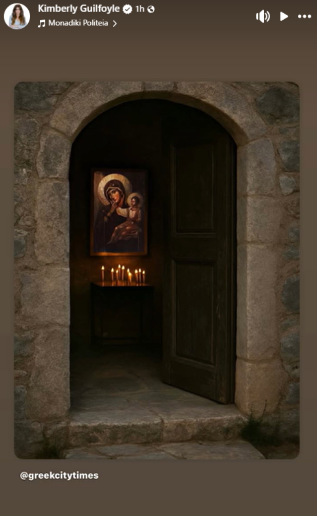 Η δεύτερη ανάρτηση, επίσης μια αναπαραγωγή από άλλο λογαριασμό, εικονίζει αναμμένα κεριά σε μια παλιά, πέτρινη εκκλησία και μια εικόνα της Παναγίας βρεφοκρατούσας.