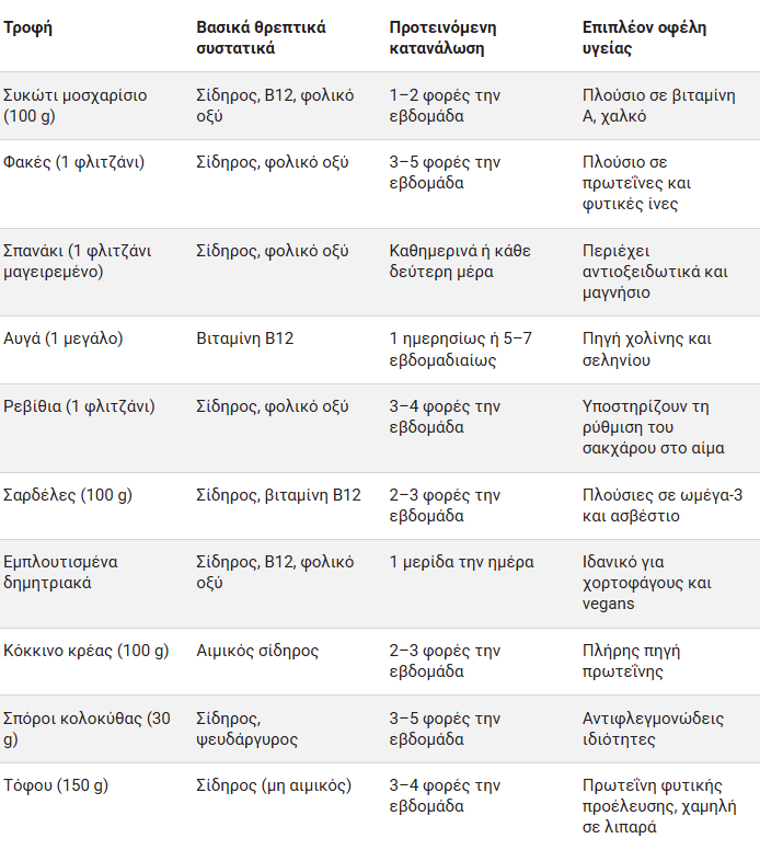 Ο παρακάτω πίνακας κατατάσσει τις κορυφαίες τροφές, που ενισχύουν τον αιματοκρίτη, με βάση την περιεκτικότητα σε σίδηρο και βιταμίνες Β, τη συνιστώμενη πρόσληψη και τα πρόσθετα οφέλη τους στην υγεία.
