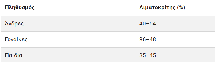Φυσιολογικά εύρη αναφοράς αιματοκρίτη: