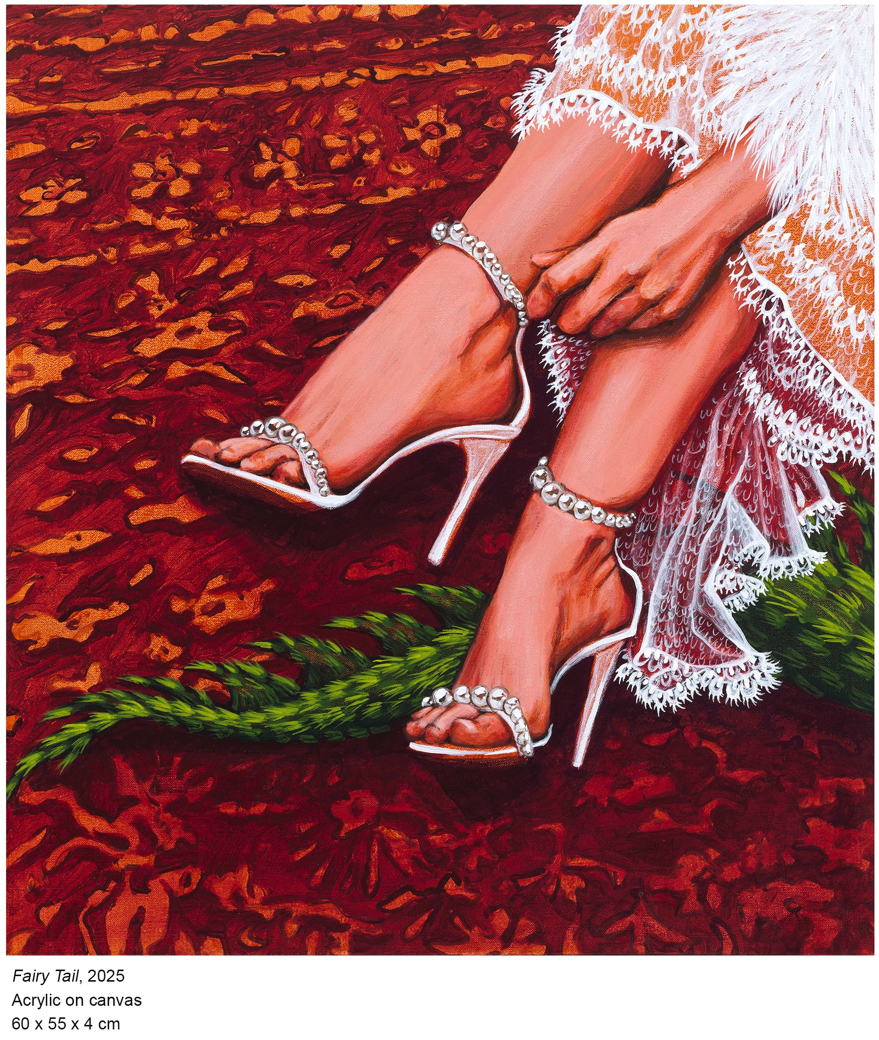 Οι πρωταγωνίστριές της, θηλυκά τοποθετημένα ανάμεσα στη στατικότητα και την ένταση, κατοικούν περιβάλλοντα που μοιάζουν ταυτόχρονα οικεία και στυλιζαρισμένα, με βλέμμα σαν να αιφνιδιάστηκαν μέσα σε μια αφήγηση που δεν έχει ακόμη λυθεί. Στα έργα της, συχνά διακοσμημένα ή φορτισμένα με συμβολισμούς, αυτές οι μορφές εμφανίζονται σαν αναρτημένες στιγμές στα κοινωνικά δίκτυα, αντιμέτωπες με τον θεατή μέσα από μια πολυεπίπεδη παρουσία.