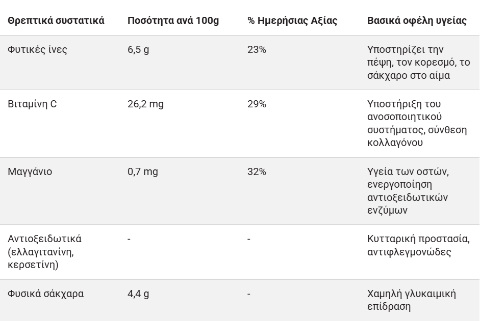 Έχουν ασυνήθιστα υψηλή περιεκτικότητα σε φυτικές ίνες και αντιοξειδωτικά, προσφέροντας ένα από τα πιο συμπυκνωμένα θρεπτικά προφίλ ανά θερμίδα από οποιοδήποτε άλλο φρούτο.