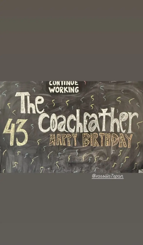 Συγκεκριμένα, η σύζυγός του, Ολυμπία Χοψονίδου, μαζί με τα έξι παιδιά τους ζωγράφισαν στον πίνακα ανακοινώσεων του σπιτιού τη φράση «Ο προπονητής/μπαμπάς – Χαρούμενα γενέθλια» για να τιμήσουν τον αγαπημένο τους και προπονητή της AS Monaco.