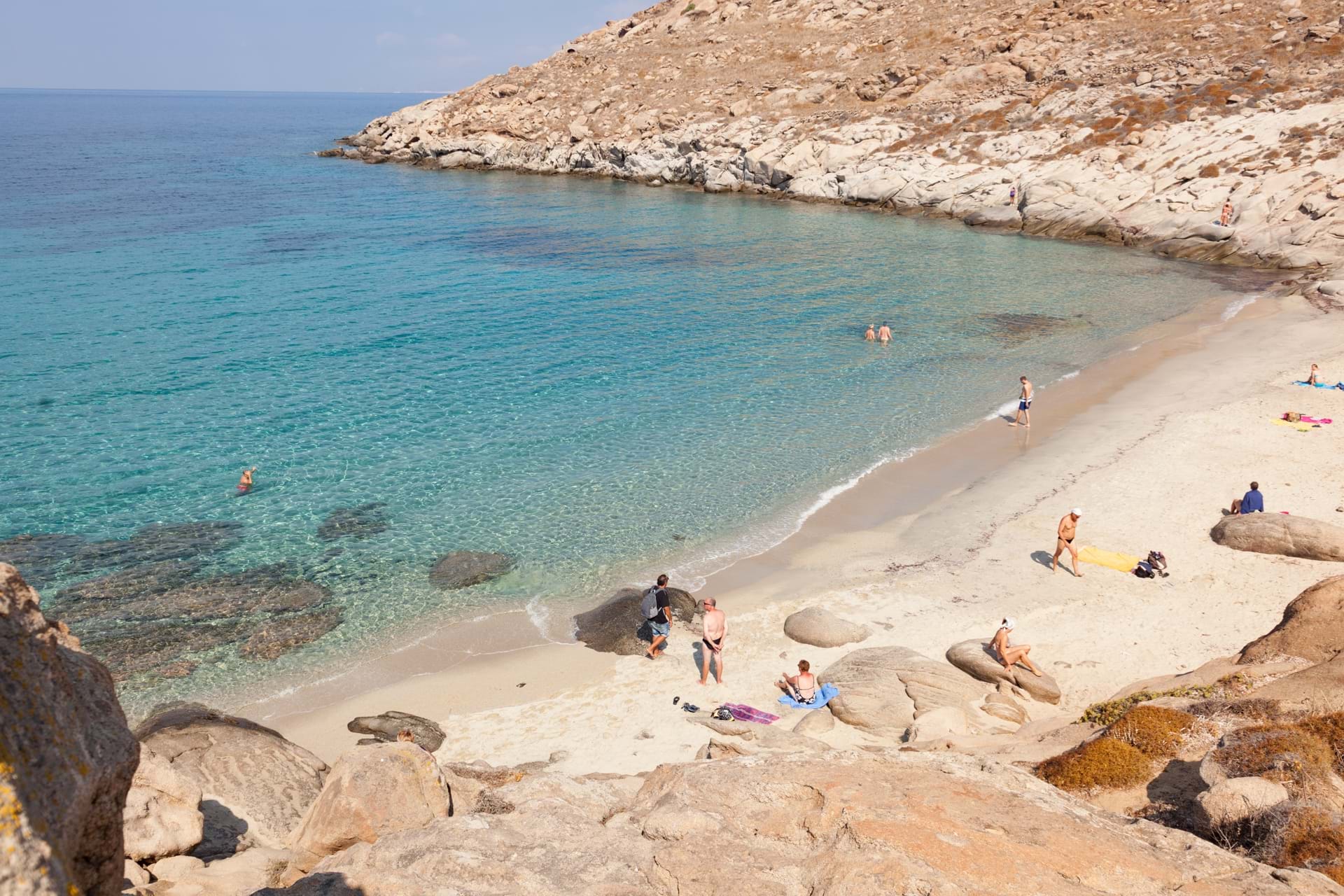 Η περιοχή της Κάπαρης στην Μύκονο έχει πολλά βράχια και ο δρόμος που οδηγεί στην παραλία είναι πολύ στενός.