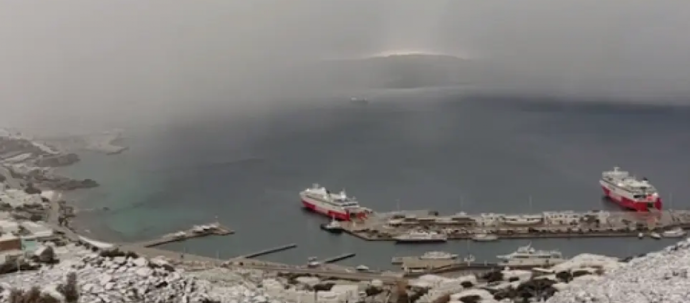 Η κακοκαιρία «Ελπίς» που πλήττει ολόκληρη την Ελλάδα «έντυσε» στα λευκά και την Μύκονο.
