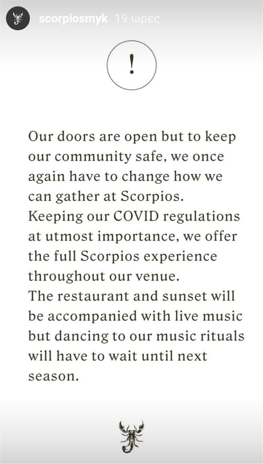 Ο διάσημος Scorpios της Μυκόνου μέσω instagram γνωστοποίησε την απόφαση που πάρθηκε ώστε να πέσει αυλαία στην διεξαγωγή πάρτι μέχρι την επόμενη σεζόν, με αφορμή τα αυστηρά μέτρα για τον κορωνοϊό.