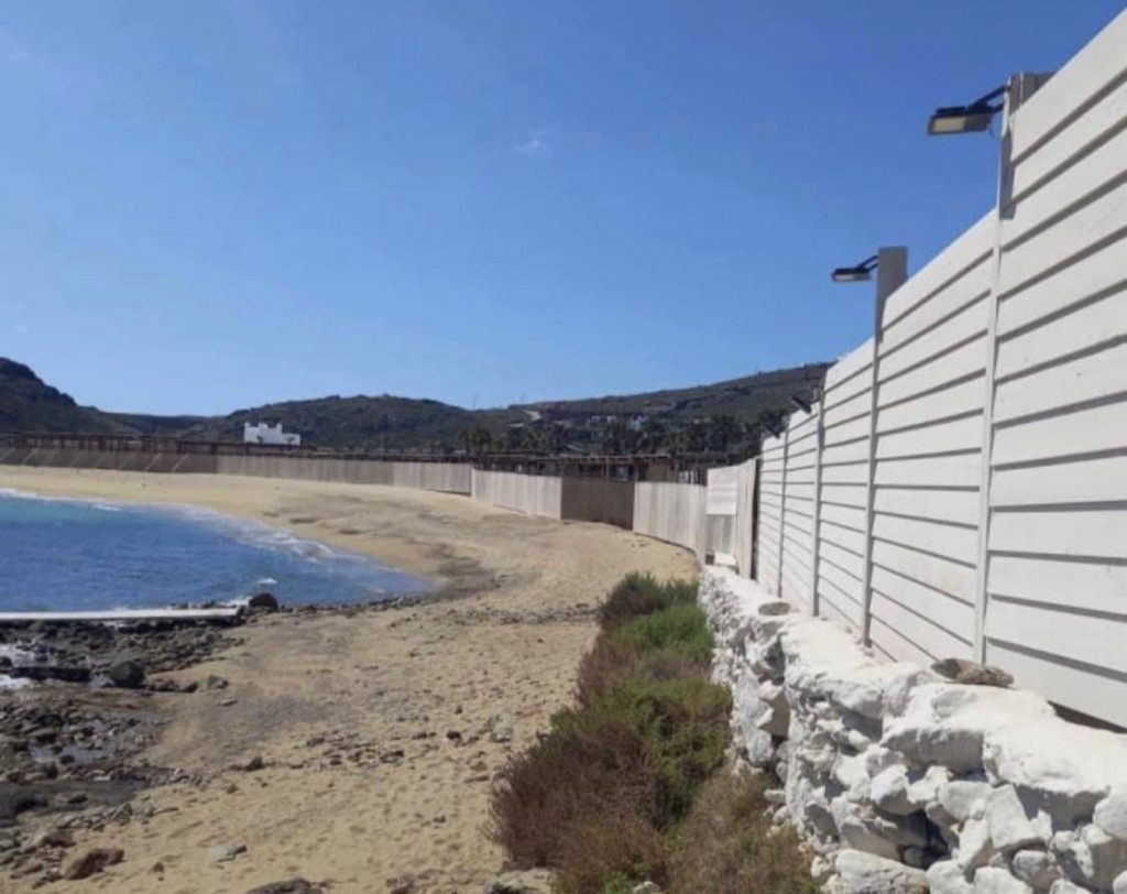 Αποκλεισμένη για τον κόσμο που θέλει να κολυμπήσει και να απολαύσει την αμμουδιά παραμένει η παραλία στον Πάνορμο στη Μύκονο, παρά τις εξαγγελίες για αποκατάσταση του νόμου και ξήλωμα των αυθαίρετων κατασκευών.