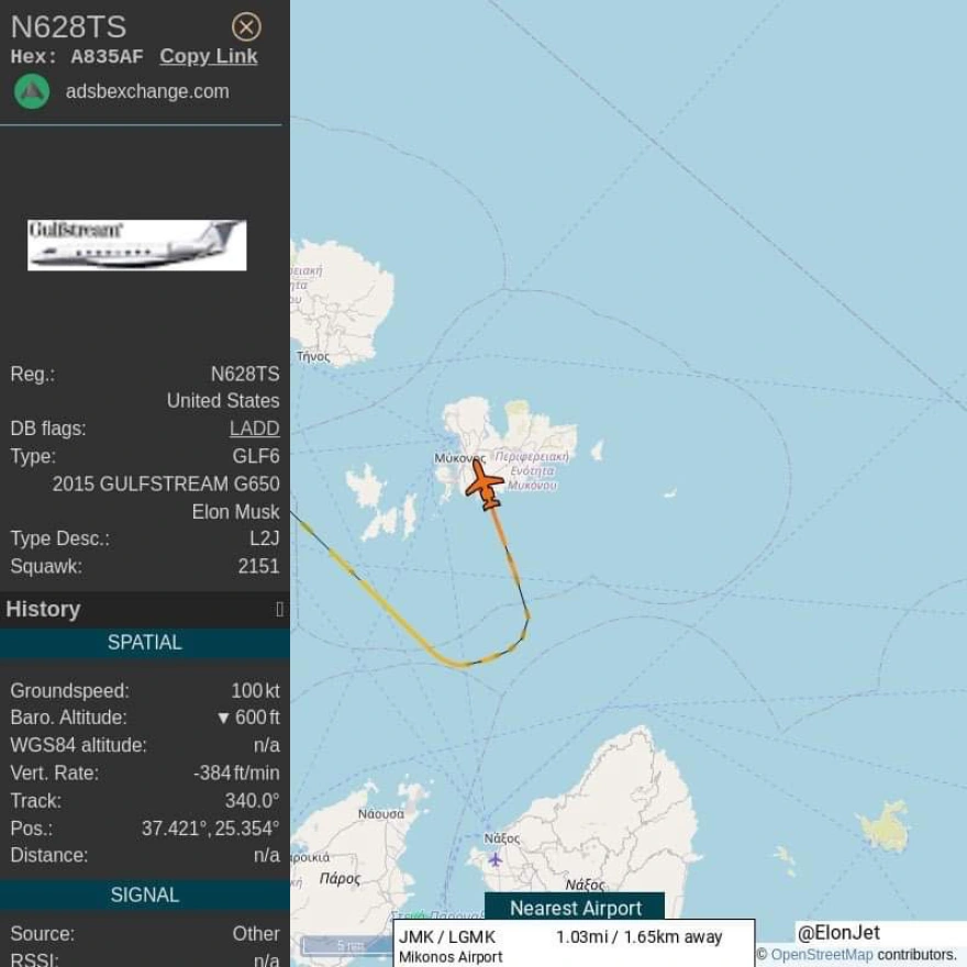 Αργά το βράδυ της Παρασκευής ένα tweet της Elon Jets έδειχνε ότι το αεροσκάφος τύπου Gulfstream του μεγιστάνα Έλον Μασκ προσγειώθηκε στο αεροδρόμιο της Μυκόνου.
