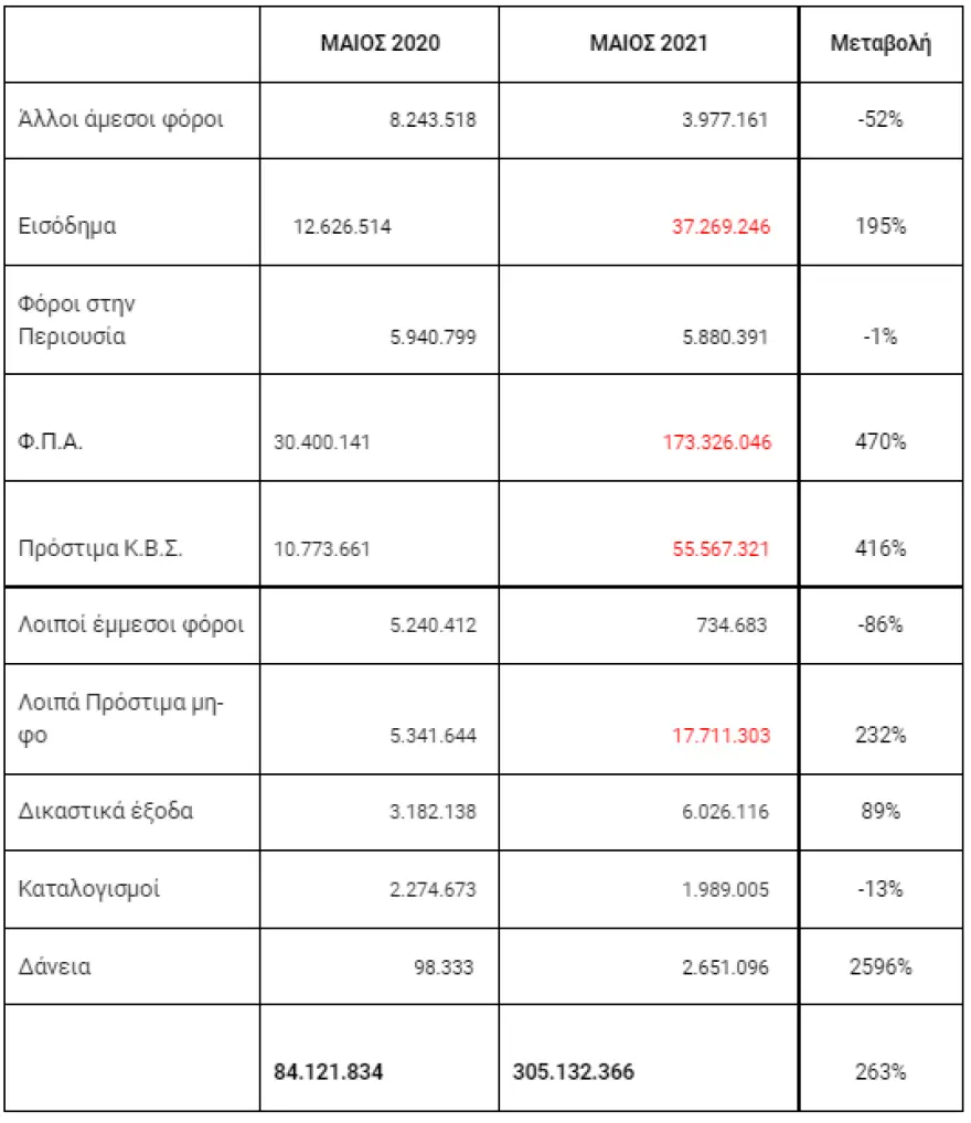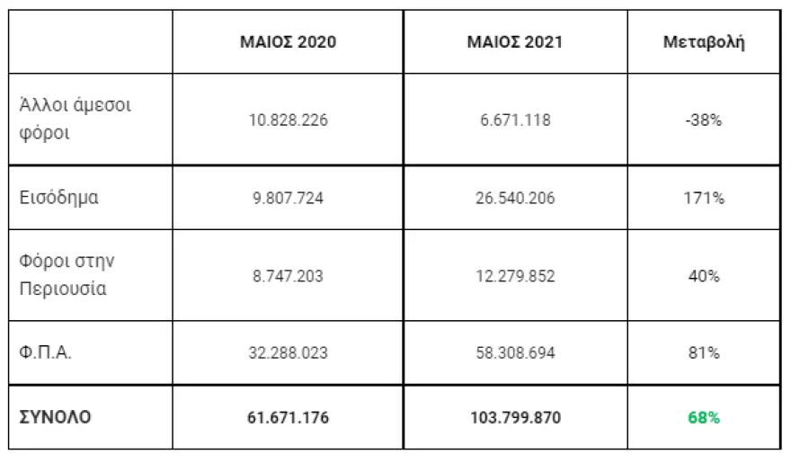 Σε ό,τι αφορά τις εισπράξεις 5μηνου, (εξαιρουμένων των μη φορολογικών κατηγοριών), έφτασαν τα 661εκ. € το 2021, ενώ την αντίστοιχη περίοδο το 2020 έφτασαν τα 450εκ € (αύξηση κατά 47%) .