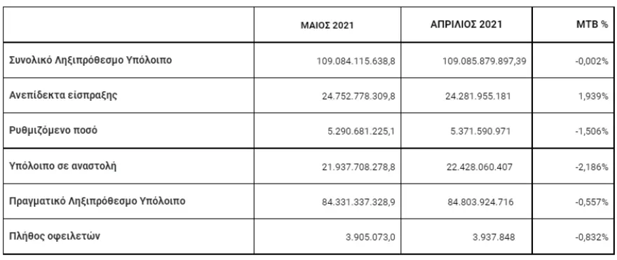 Για το 5μηνο, το νέο ληξιπρόθεσμο, συμπεριλαμβανομένων των μη φορολογικών κατηγοριών, έφτασε τα 2.901εκ., ενώ την ίδια περίοδο το 2020 είχε φτάσει τα 2.523εκ. (αύξηση κατά 15%).