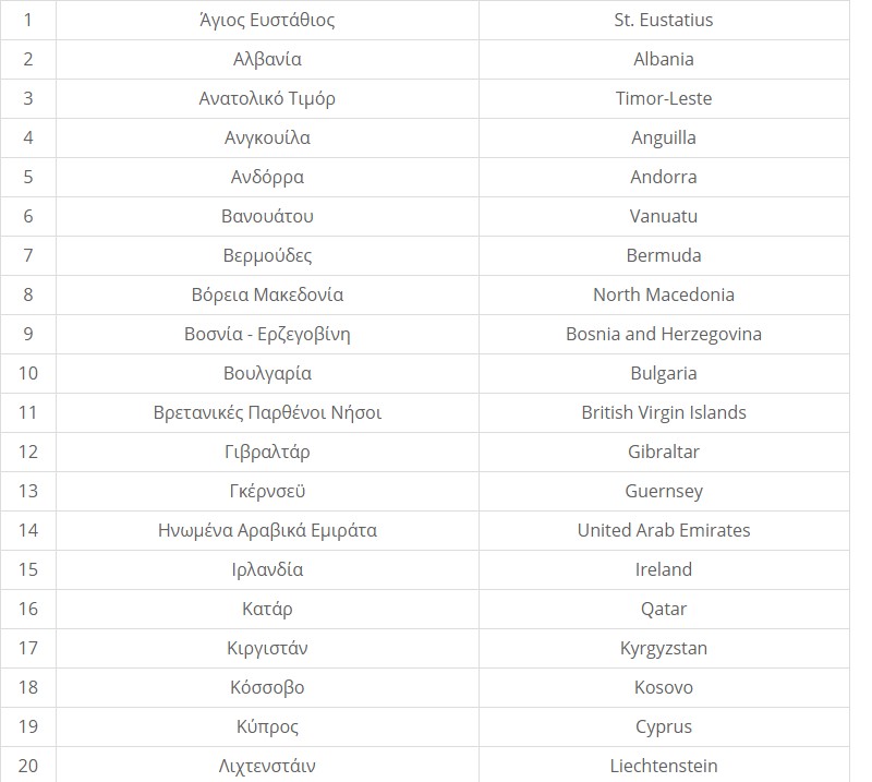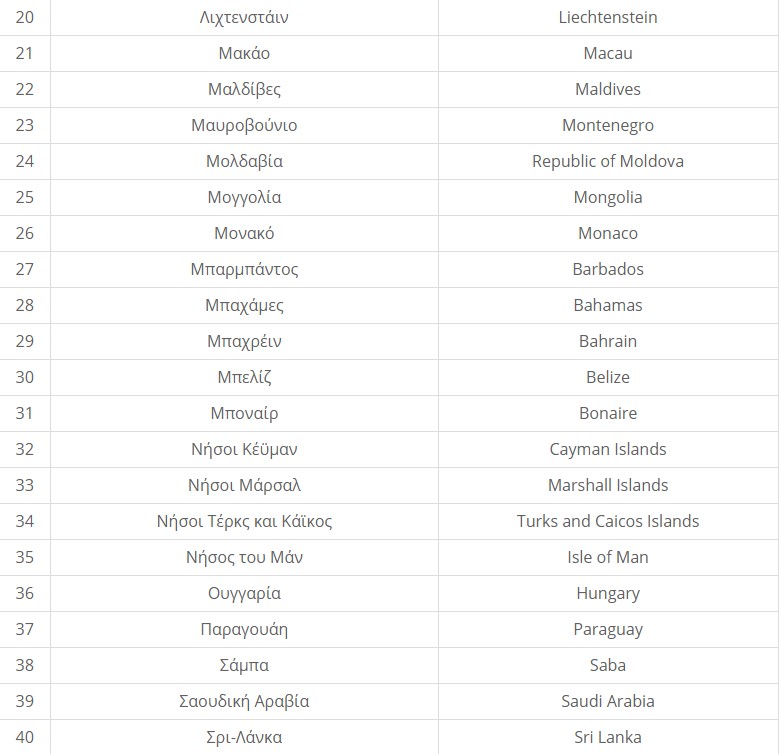 Το υπουργείο Οικονομικών μέσω επίσημης ανακοίνωσης γνωστοποίησε τα 40 κράτη με το προνομιακό καθεστώς για το φορολογικό έτος 2020.
