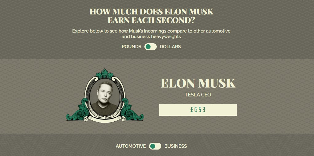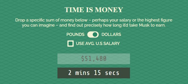 Ίσως γι’ αυτό το λόγο μία βρετανική εταιρεία ενοικίασης αυτοκινήτων, η Select Car Leasing, αποφάσισε να δημιουργήσει μια (καταθλιπτική) πλατφόρμα, στην οποία μπορεί ο καθένας να τεστάρει σε πόση ώρα ο Elon Musk βγάζει τα χρήματα, που εκείνος παίρνει μέσα σε ένα μήνα ή έναν χρόνο.