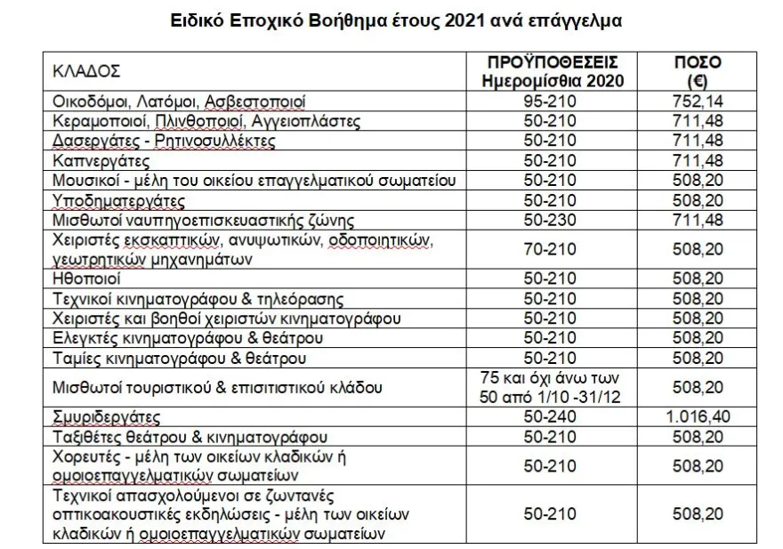 Δείτε τον πίνακα τις ειδικότητες που δικαιούνται το επίδομα και το ποσό του ειδικού εποχικού βοηθήματος έτους 2021 ανά επάγγελμα.