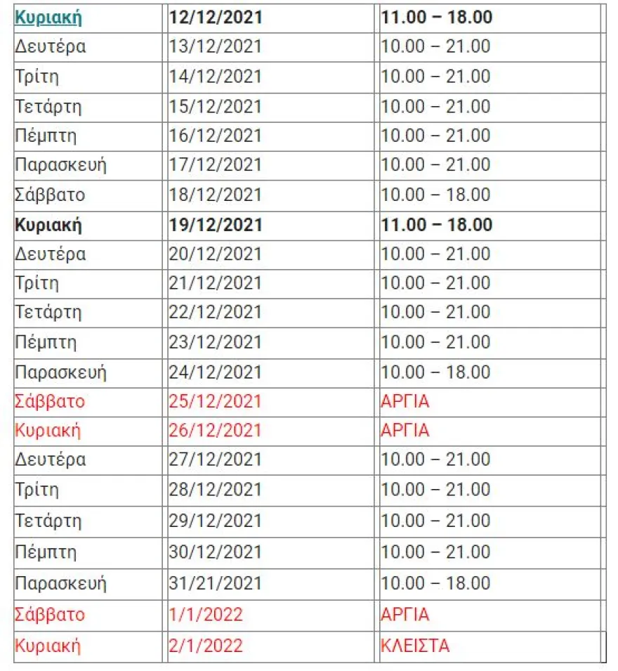 Σύμφωνα με το πρόγραμμα, το λιανεμπόριο θα μείνει ανοιχτό την Κυριακή 19 Δεκεμβρίου και θα κλείσει το Σαββατοκύριακο 25-26/12 όπως και το Σαββατοκύριακο 1-2 Ιανουαρίου. Επίσης την παραμονή των Χριστουγέννων και της Πρωτοχρονιάς τα καταστήματα θα είναι ανοιχτά έως τις 6 το απόγευμα και τις υπόλοιπες ημέρες έως τις 9 το βράδυ.