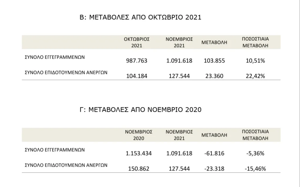 Σύμφωνα με τον ΟΑΕΔ, οι εγγεγραμμένοι άνεργοι Νοεμβρίου αυξήθηκαν κατά 103.855 άτομα συγκριτικά με τον Οκτώβριο 2021 και κατά 23.360 οι επιδοτούμενοι άνεργοι κυρίως λόγω της εποχικότητας.