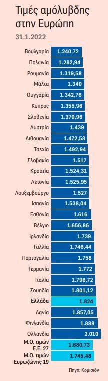 Η τιμή της ελληνικής αμόλυβδης είναι αισθητά υψηλότερη και από τον μέσο όρο των τιμών στην ΕΕ των 27 (1,680 ευρώ/λίτρο) αλλά και σε επίπεδο Ευρωζώνης (1,745 ευρώ/λίτρο).