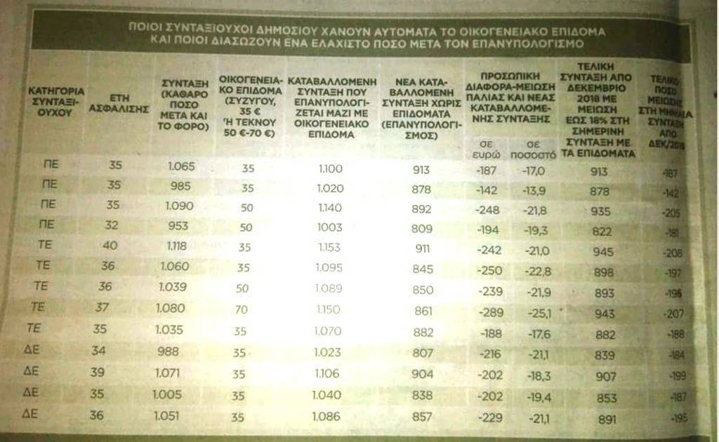 Ο λόγος που οι προσωπικές διαφορές φτάνουν στο 18% ή και παραπάνω είναι διότι στη σύνταξη που επανυπολογίζεται λαμβάνεται υπόψη και το οικογενειακό επίδομα. Αυτό το ποσό συγκρίνεται με τη νέα επανυπολογισμένη σύνταξη, που είναι μικρότερη και δεν έχει επιδόματα. Αυτό σημαίνει ότι μπορεί μια επανυπολογισμένη σύνταξη να είναι μικρότερη έως 12%, αλλά με την προσθήκη των επιδομάτων η διαφορά φτάνει ή και περνάει το 18%. Στην πράξη όσοι έχουν από σύνταξη και οικογενειακό επίδομα προσωπική διαφορά έως 18% με τον επανυπολογισμό χάνουν και σύνταξη και επίδομα!