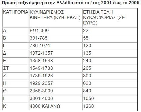 – Από 22- 1.260 ευρώ για οχήματα που κυκλοφόρησαν από 2001 έως 2005